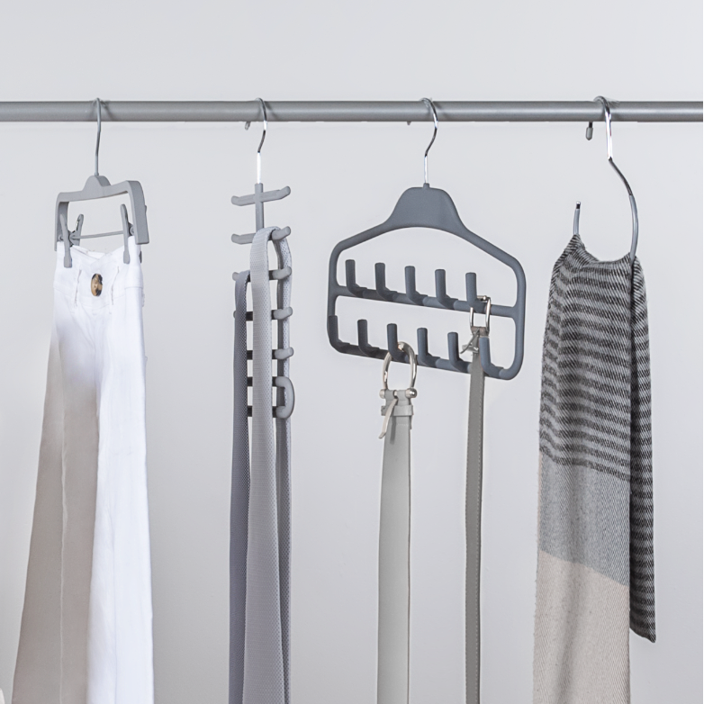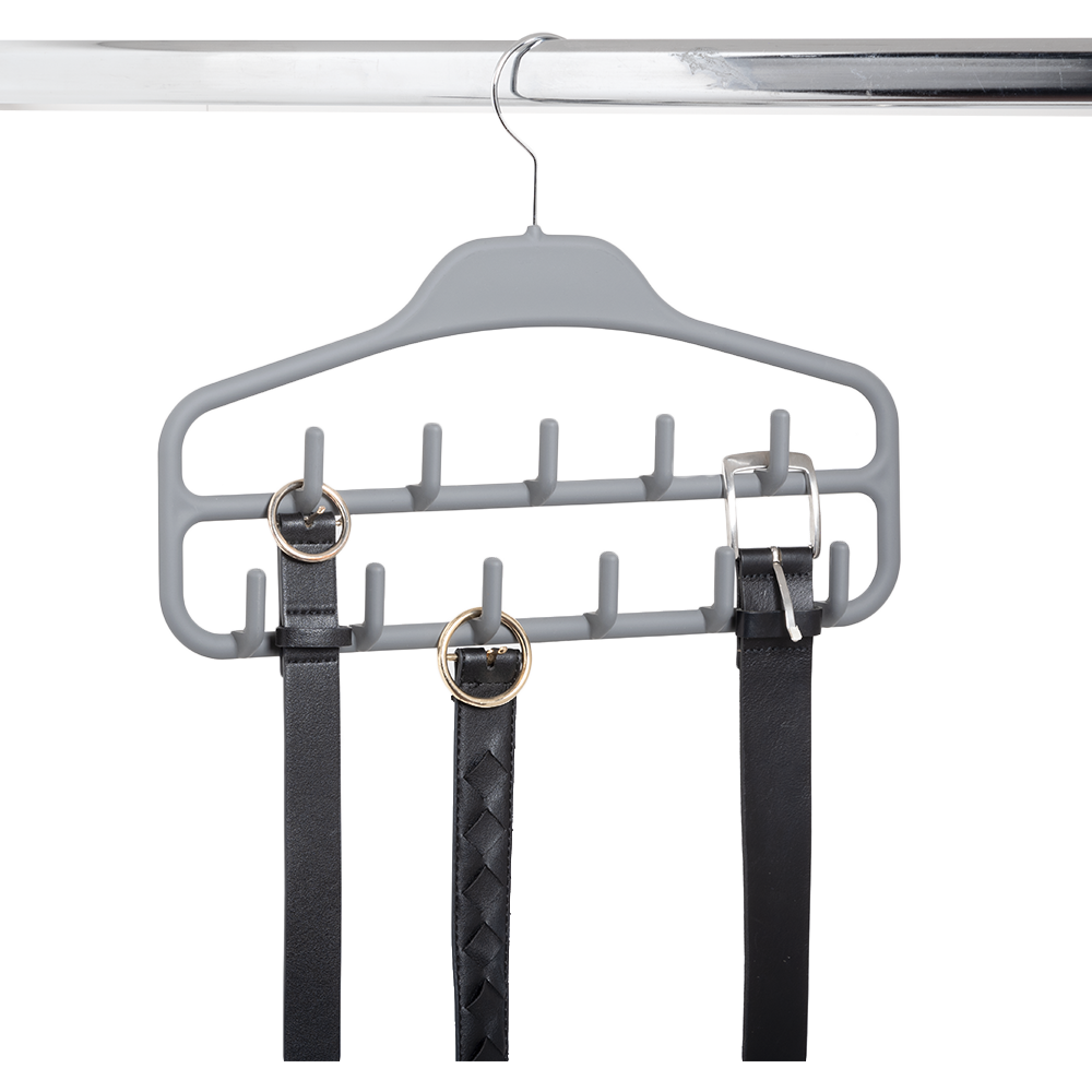 Gancho para cinturones color gris de 27 cm de largo x 35 cm de ancho x 0.04 cm de alto, fabricado en metal y silicón.