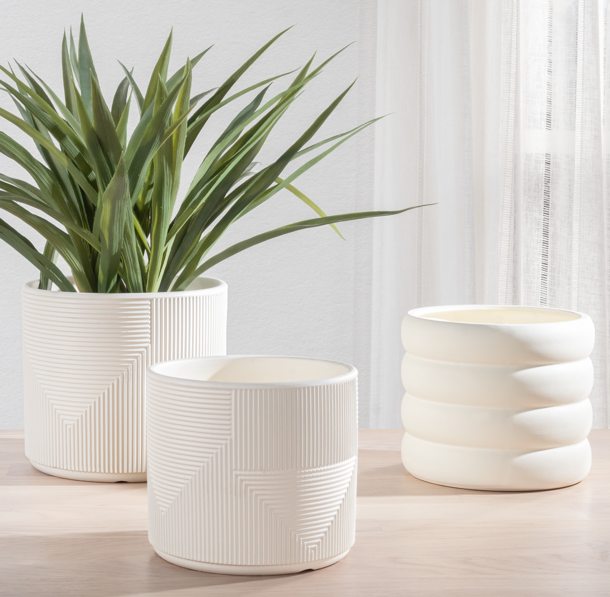 Maceta Teya color blanca, fabricada en cerámica, disponible en las siguientes medidas: