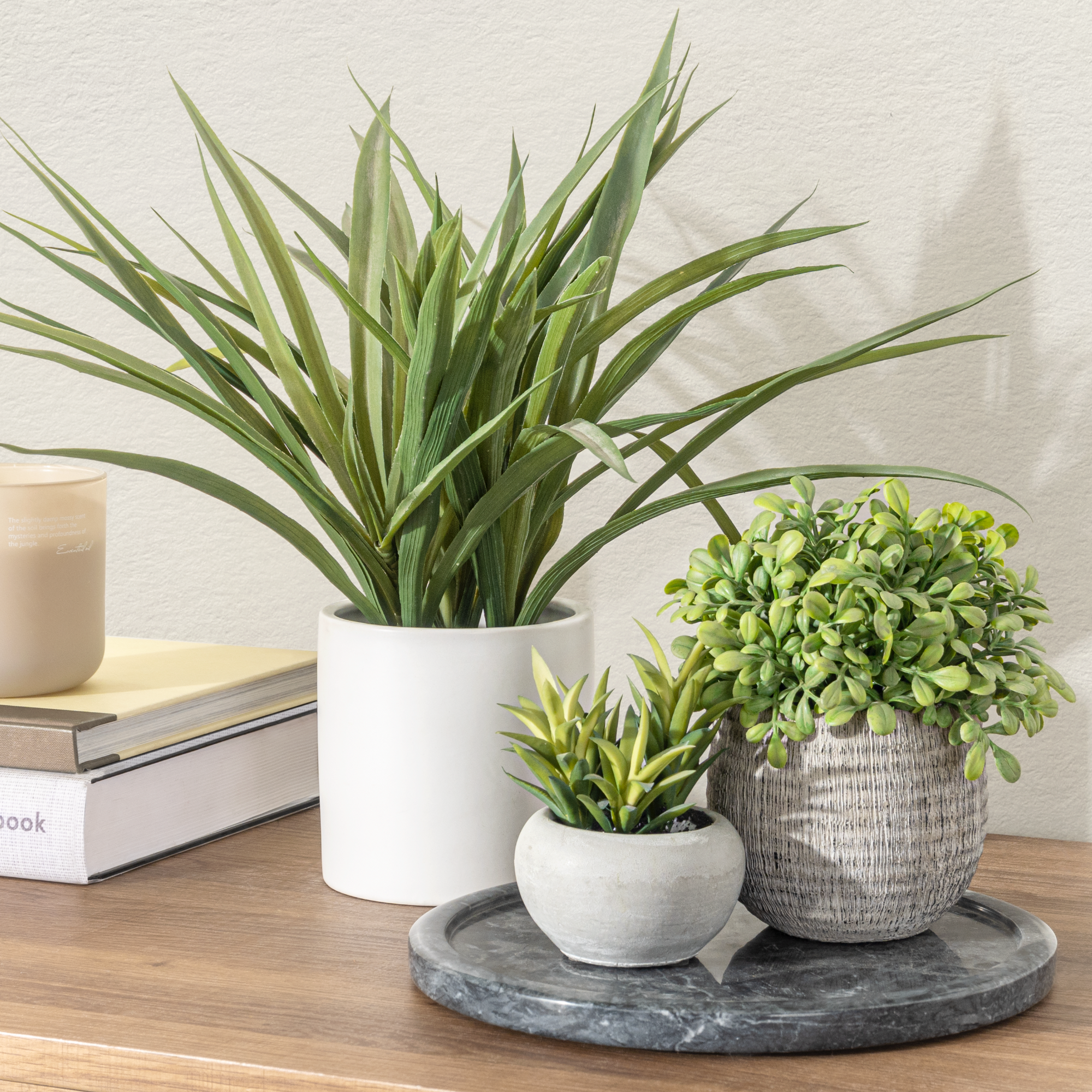 Planta artificial Austa color verde de 17.78 cm de largo x 17.78 cm de ancho x 19.05 cm de alto, fabricado en cemento y plástico.