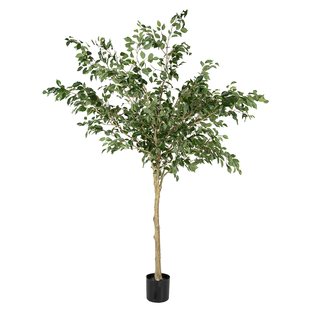 Planta Artificial Ficus en color verde de 228 cm de alto, fabricado en 54% poliuretano, PEVA, 34% PE, 10% alambre de hierro y 2% cemento.