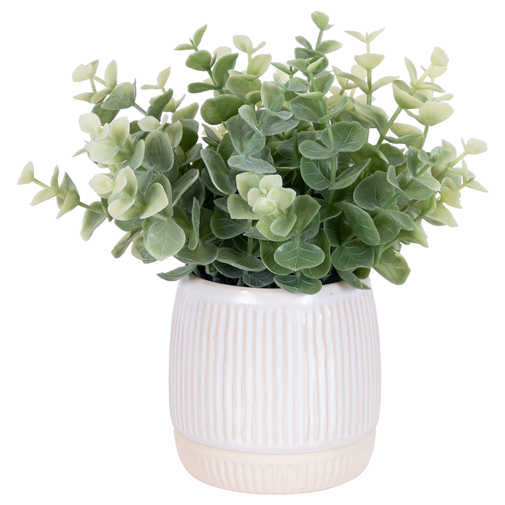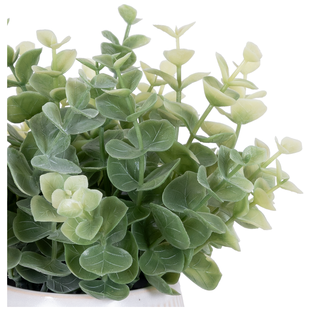 Planta Artificial Eucalipto de color verde de 19 cm de largo x 19 cm de ancho x 21 cm  de alto, fabricado en poliéster, plástico y cerámica.