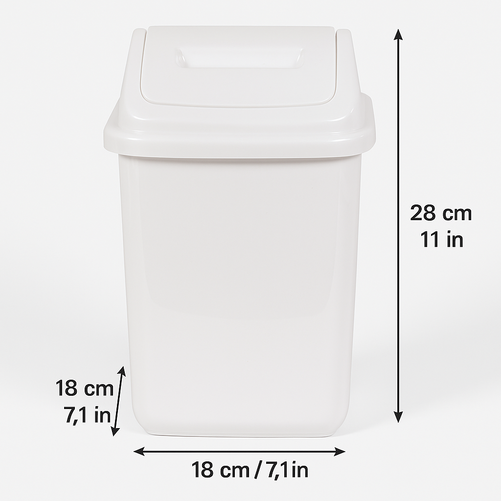 Bote de basura con balancin de 5 Litros color blanco de 18 x 18 x 28 cm fabricado en plástico.