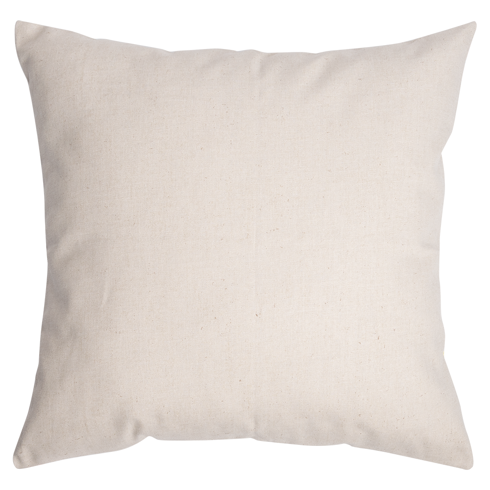 Funda de cojín color lila con beige de 50 cm de largo x 50 cm de ancho, fabricado en poliéster y algodón.