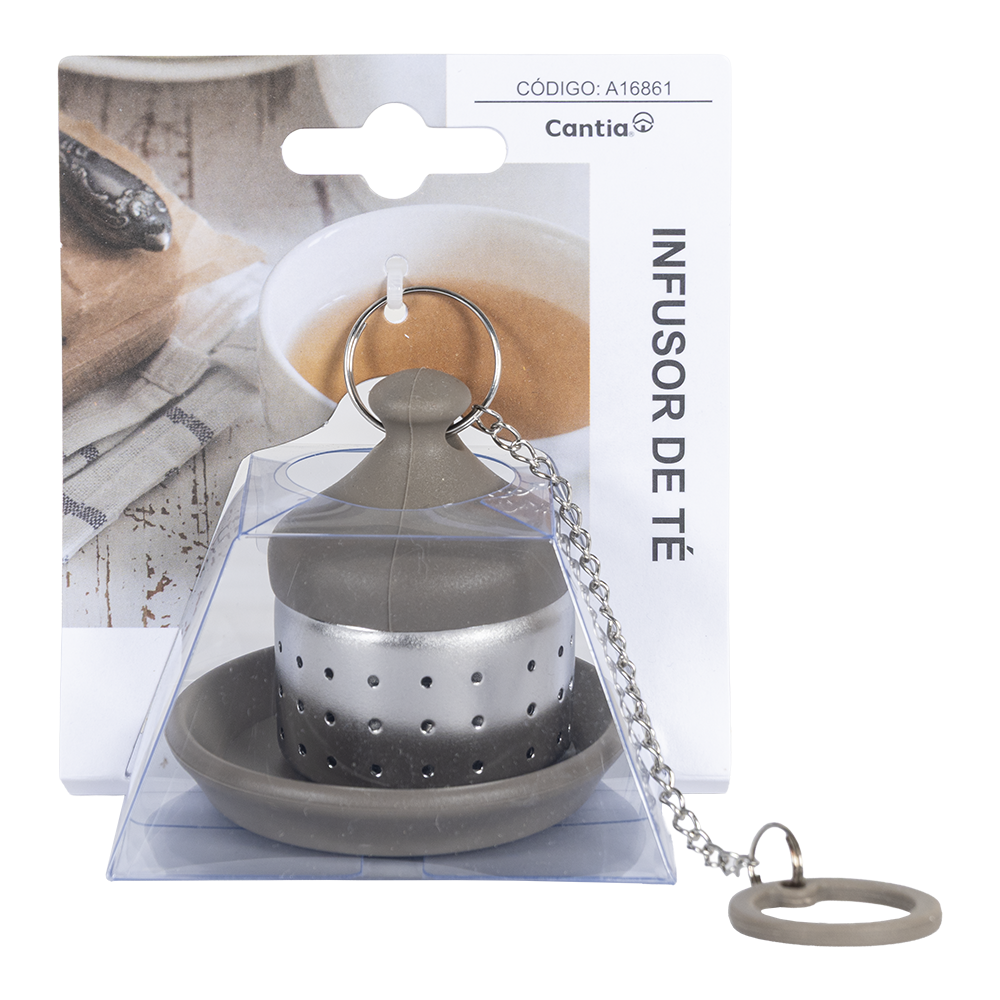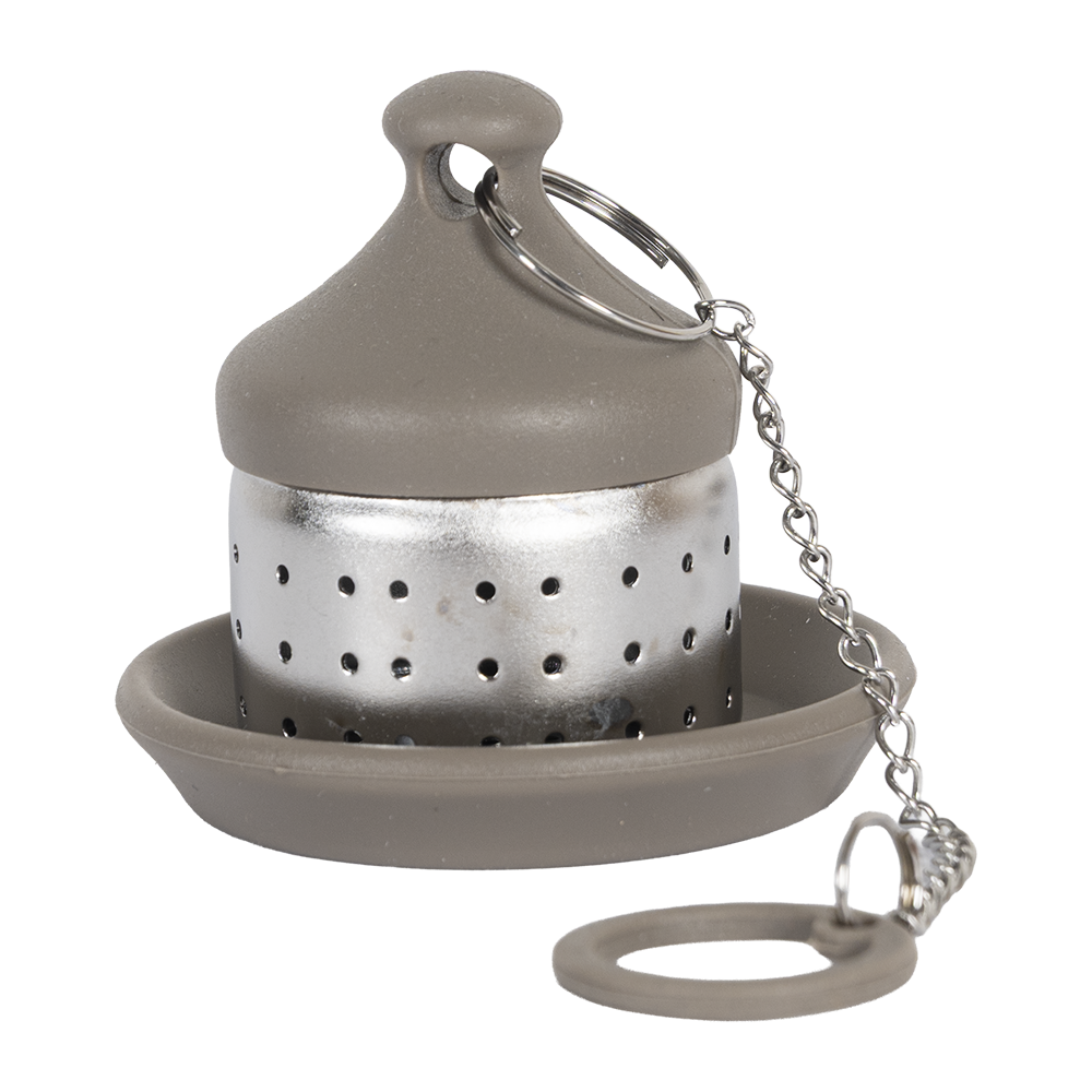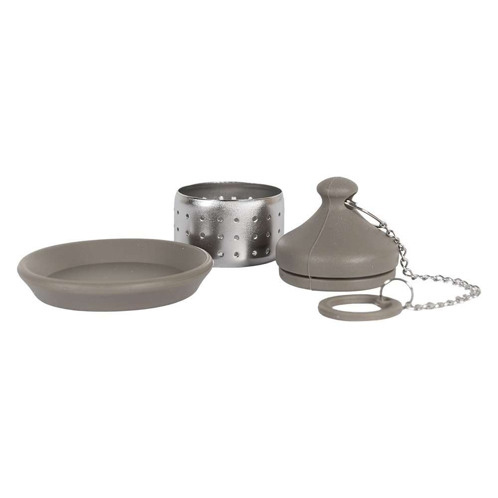 Infusor De Te color plata con gris, fabricado en acero inoxidable.