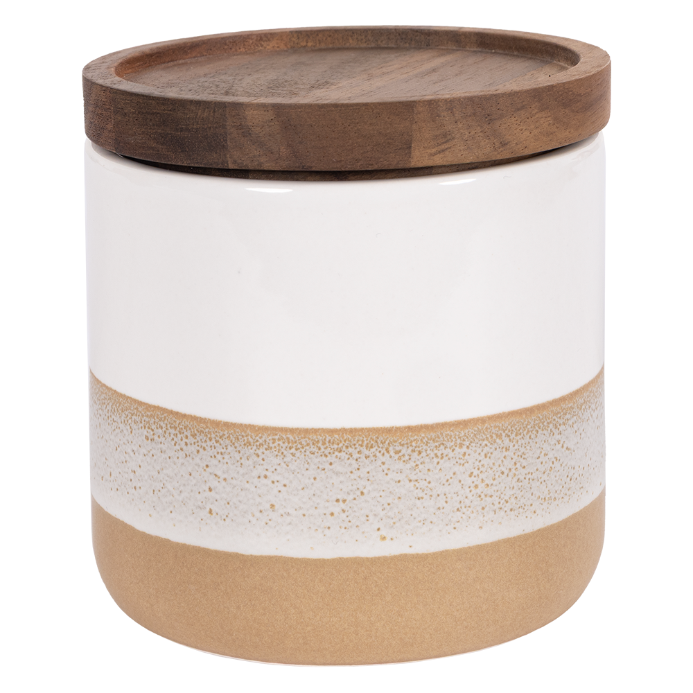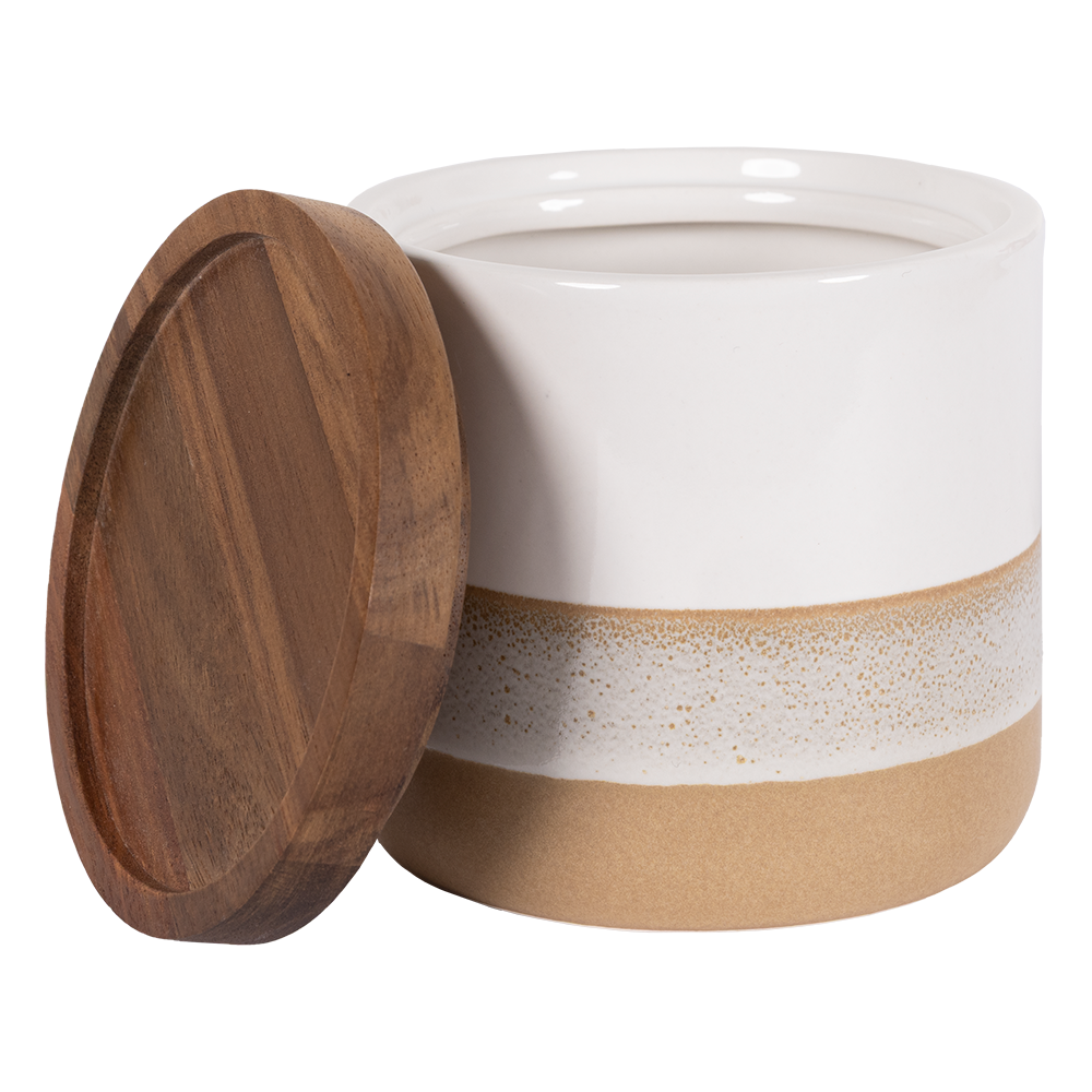Algodonera Irma en color blanco con café de 10 cm de largo x 10 cm de ancho x 11 cm de alto, fabricado en Cerámica y Madera Acacia.