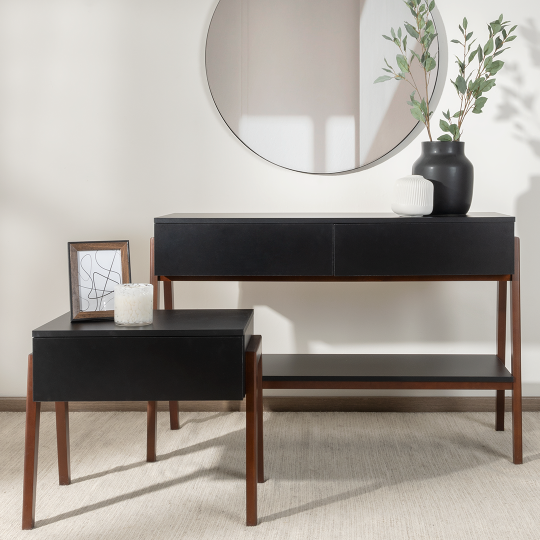Buró Alamos Diseñado en acabado negro con nogal de 60 cm de largo x 40 cm de ancho x 51.7 cm de alto, fabricado en tablero y madera solida.