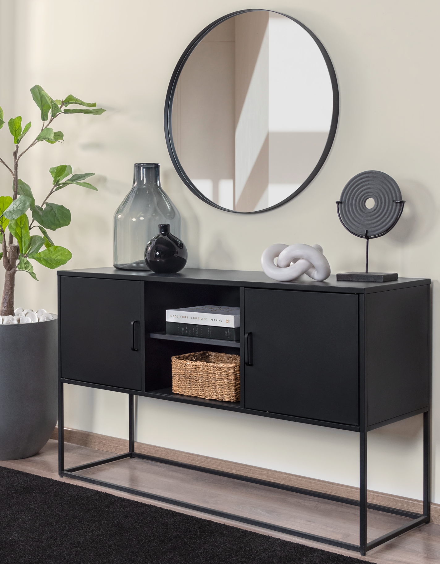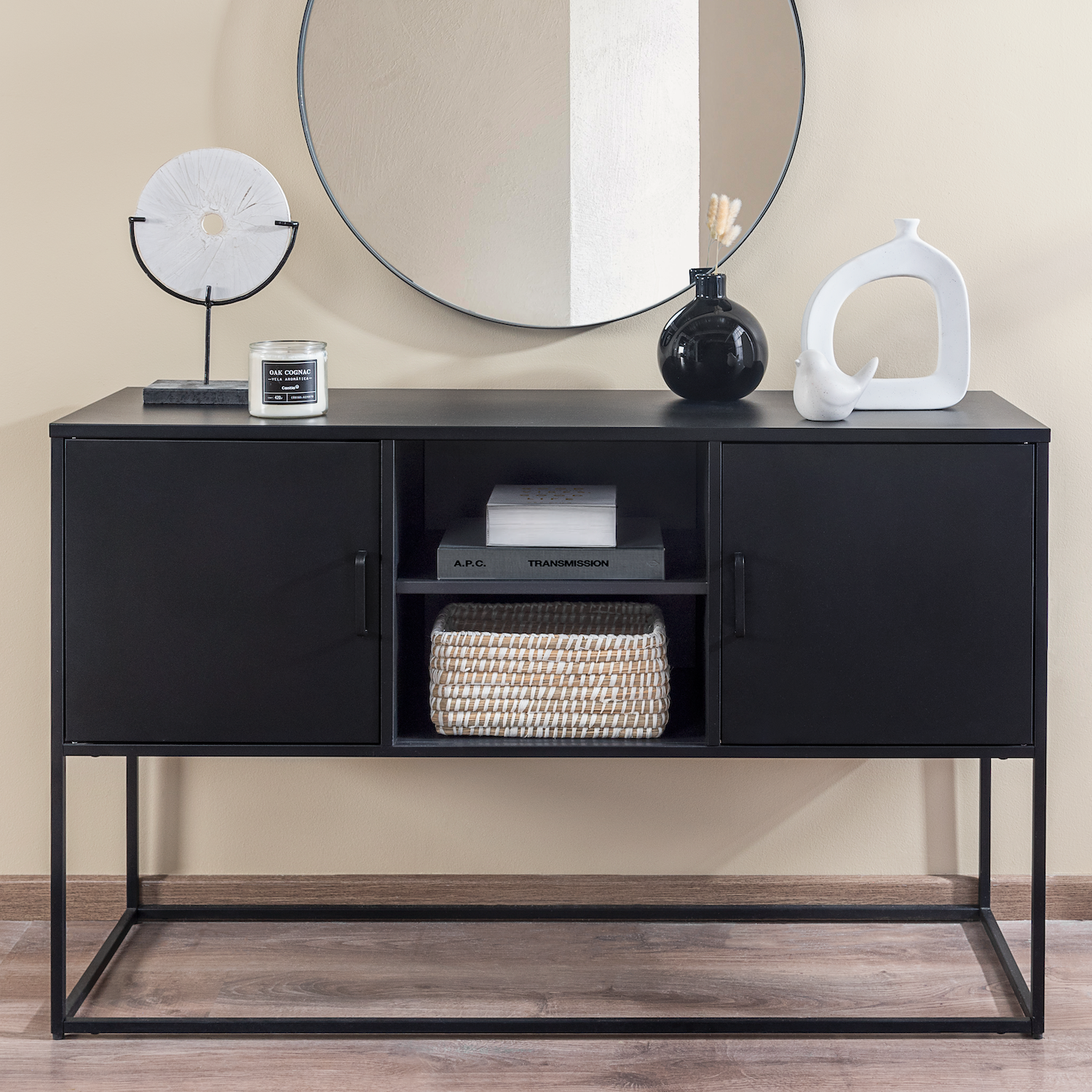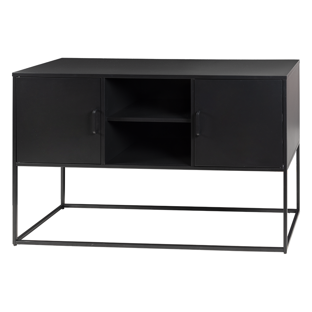 Cómoda Hungría diseñada en un acabado negro mate de 120 cm de largo x 40 cm de ancho x 75 cm de alto, fabricado en metal.