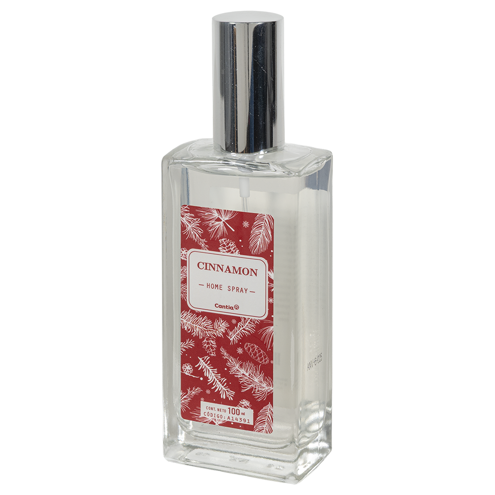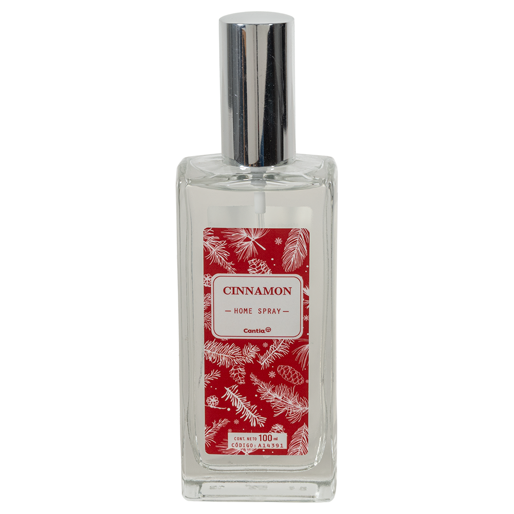 Difusor en spray Cinnamon de 100 ml fabricado en vidrio de 14 x 4.5 cm con un aroma a vainilla, naranja, manzana y canela.