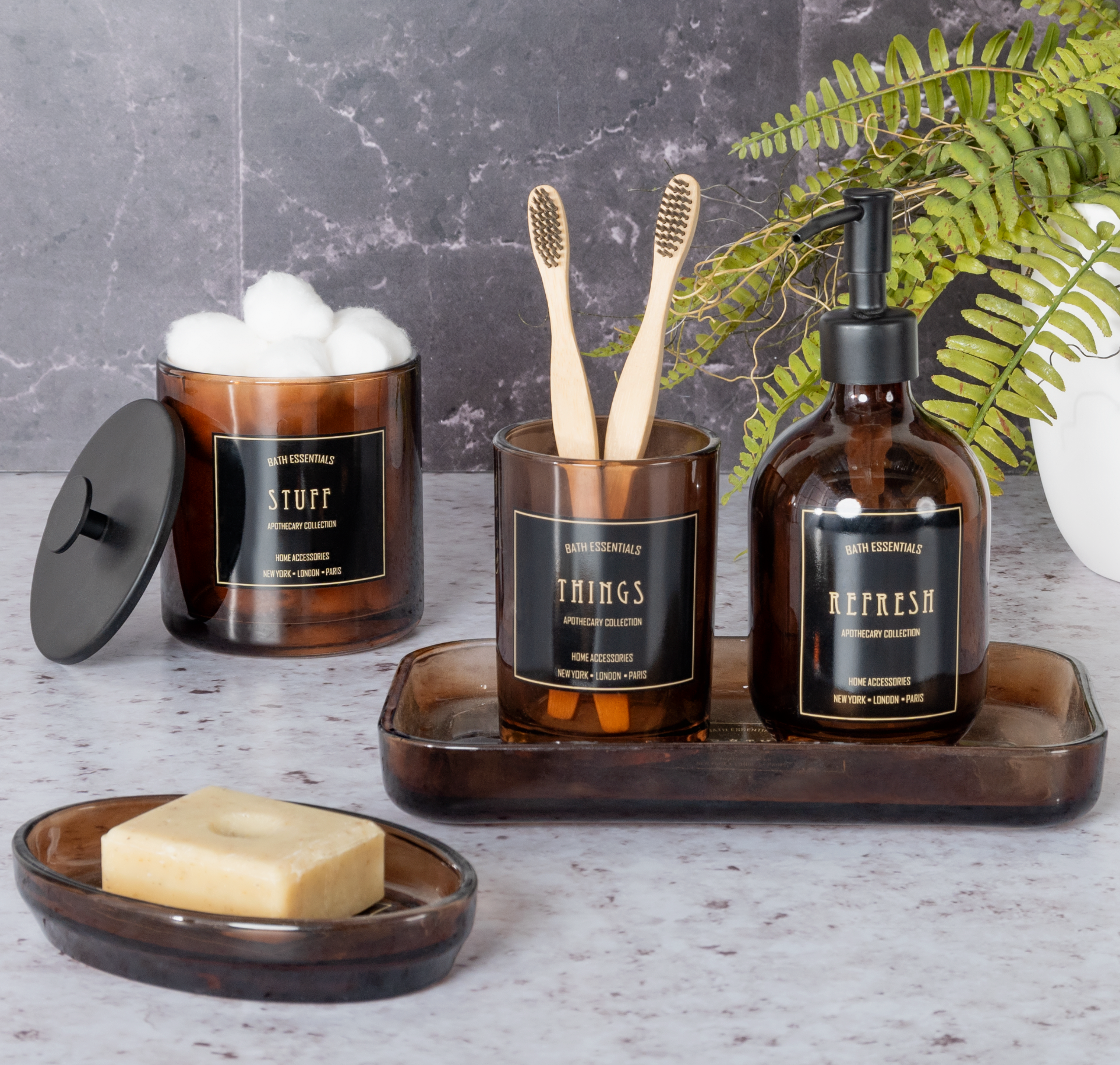 Dispensador De Jabón Luxen color ámbar, fabricado en acero inoxidable y vidrio. Medida de 8 cm de largo x 8 cm de ancho x 18.5 cm de alto.