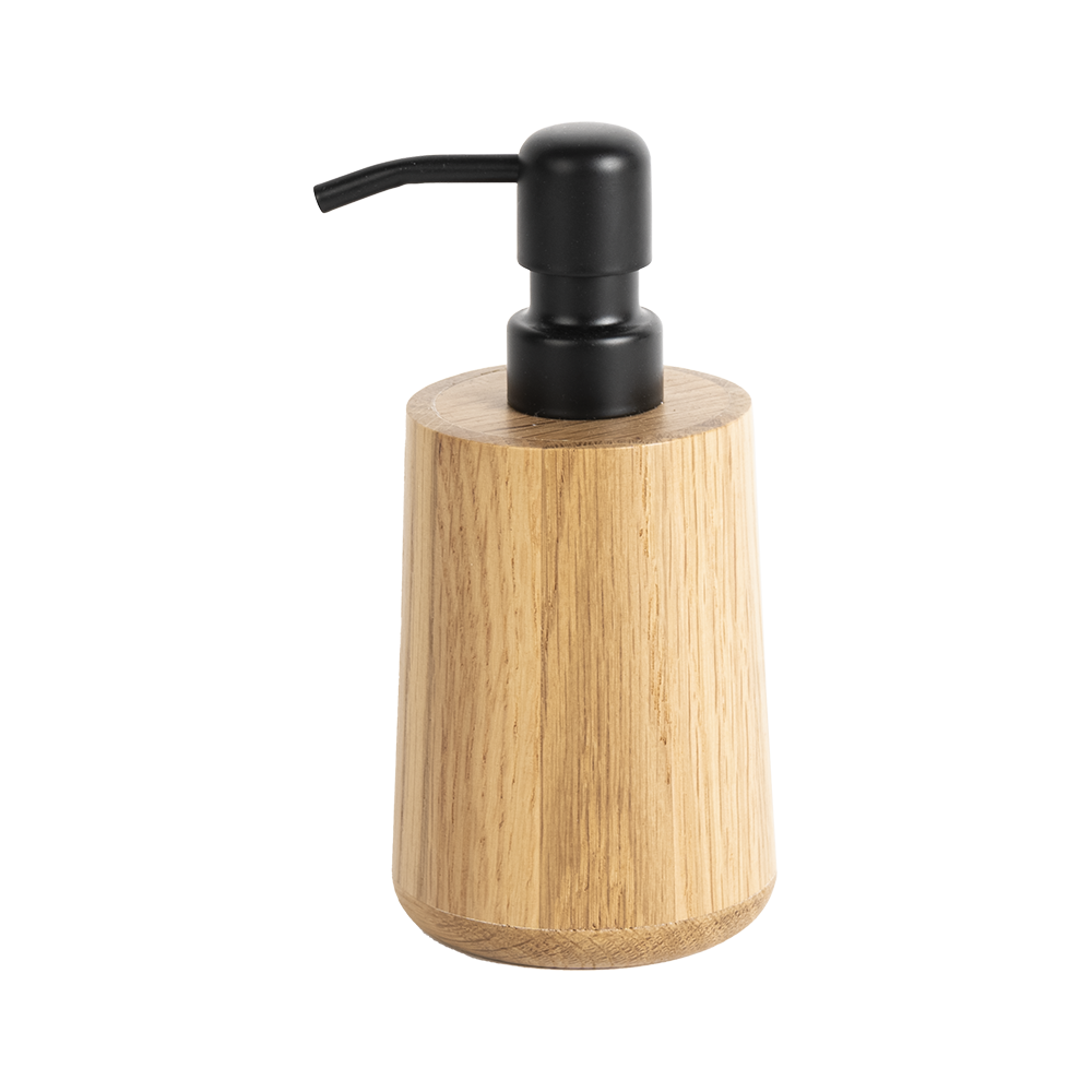 Dispensador de Jabón Safeti color natural, fabricado en madera de roble y metal.