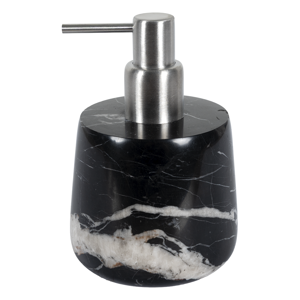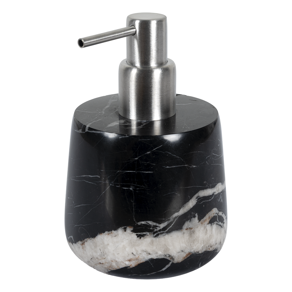 Dispensador de jabón Surtaen color negro marmoleado, de 9.5 cm de diámetro x 13.3 cm de alto, fabricado en mármol.