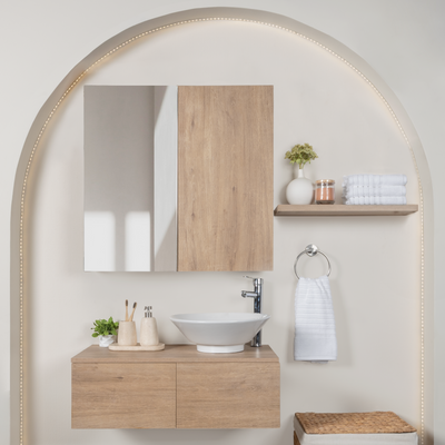 Módulo de Baño Boca, Disponible en acabado avellana, En una Medida de 80 cm de largo x 46 cm de ancho x 26.8 de alto. Fabricado en Tablero de alta calidad.
