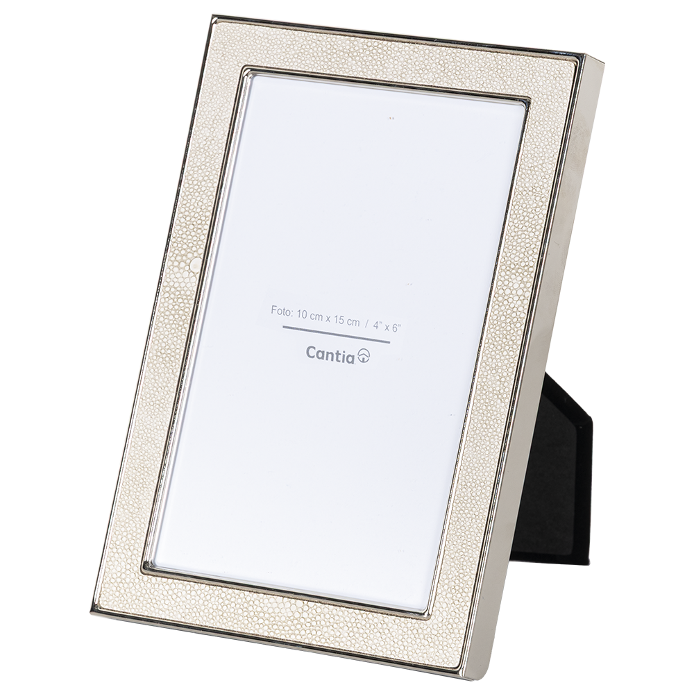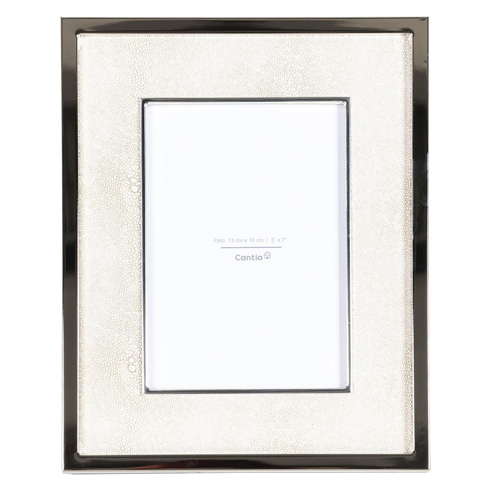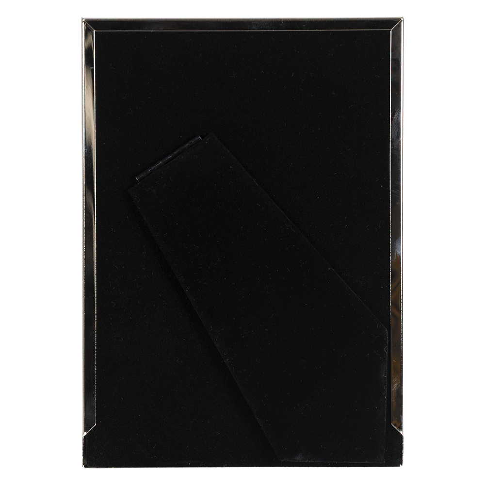 Portarretrato Budai en color plateado de 17.2 cm de largo x 12.1 cm de ancho x 1.9 cm de alto, fabricado en acero.