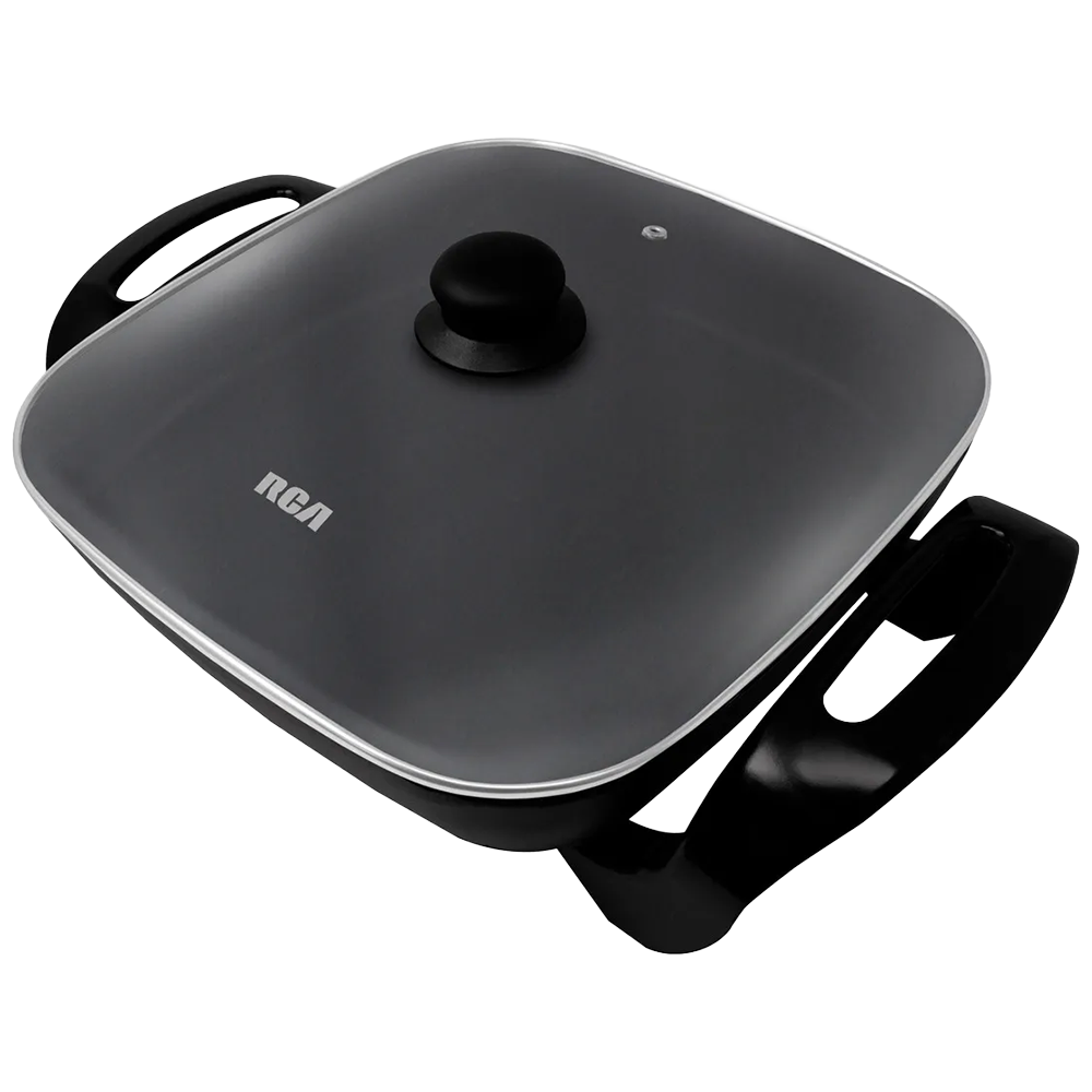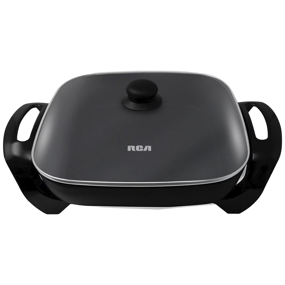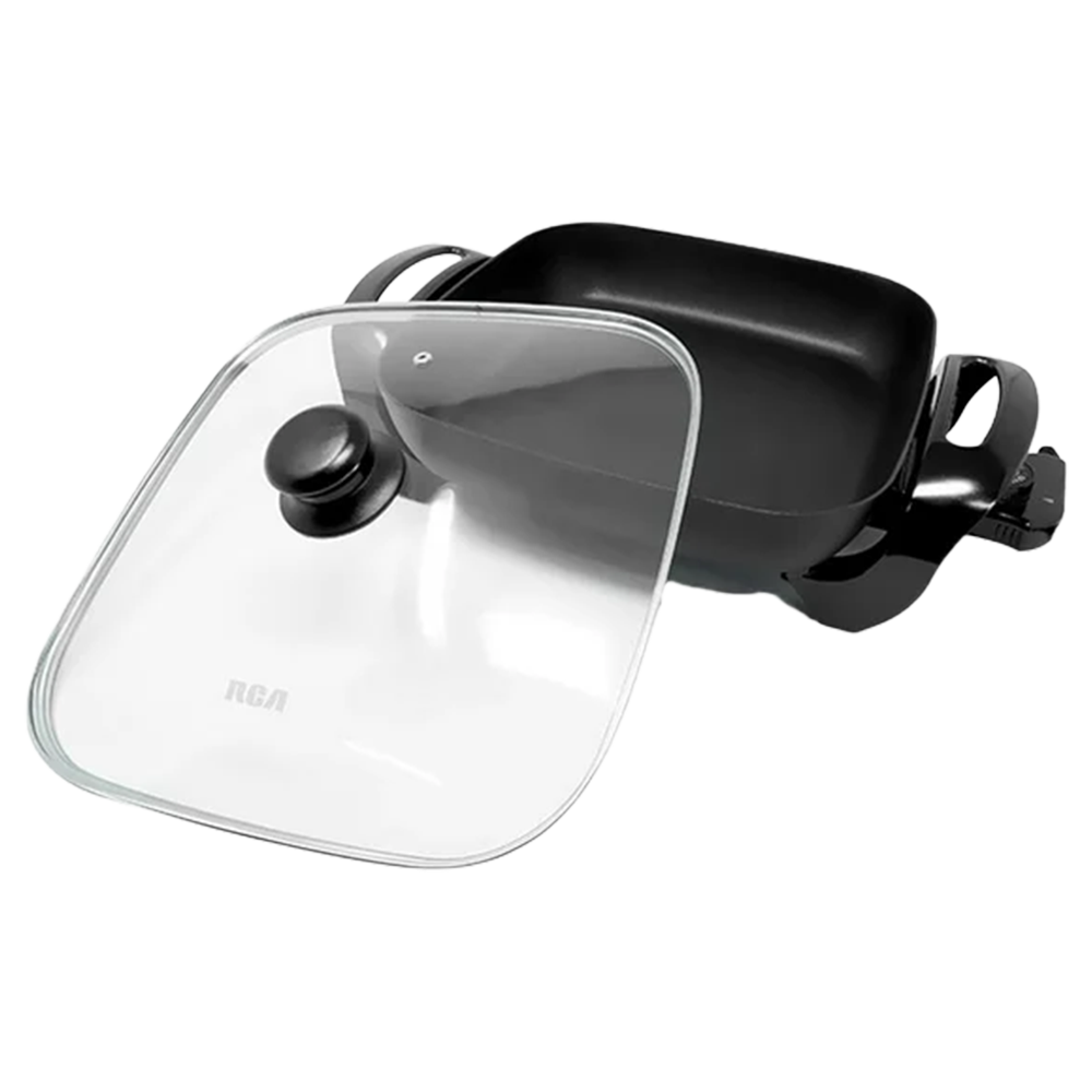 Sartén Eléctrico en color negro de 41.5 cm de largo x 30 cm de ancho x 18 cm de alto, fabricado en metal, plástico y vidrio.