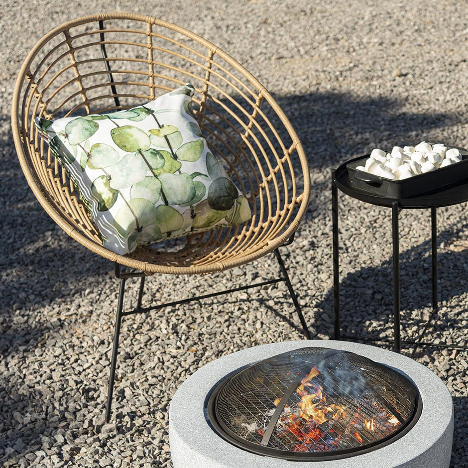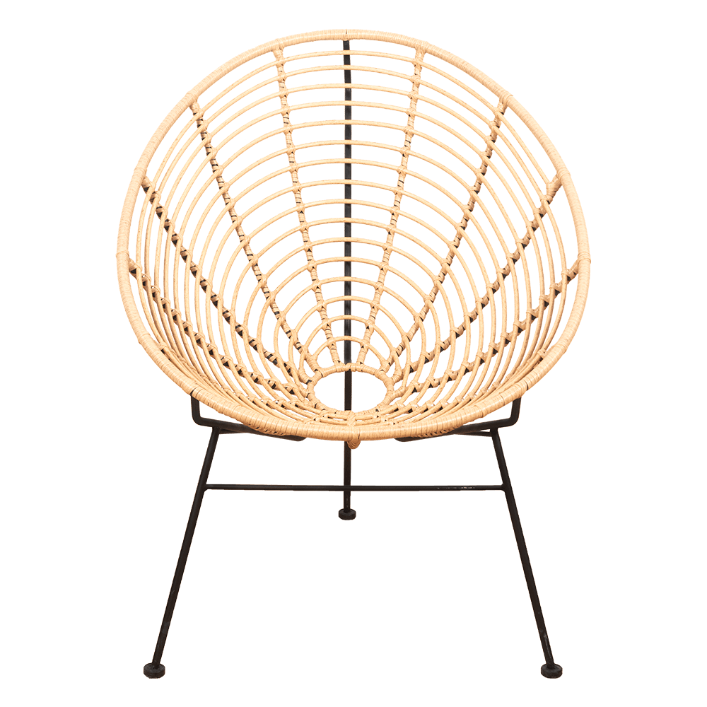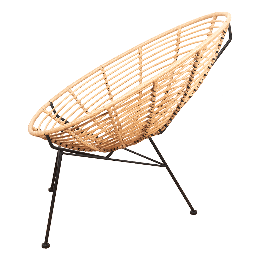 Silla Acapulco en color mimbre de 74 cm de largo x 81 cm de ancho x 88 cm de alto, fabricada en fierro y mimbre de polietileno.