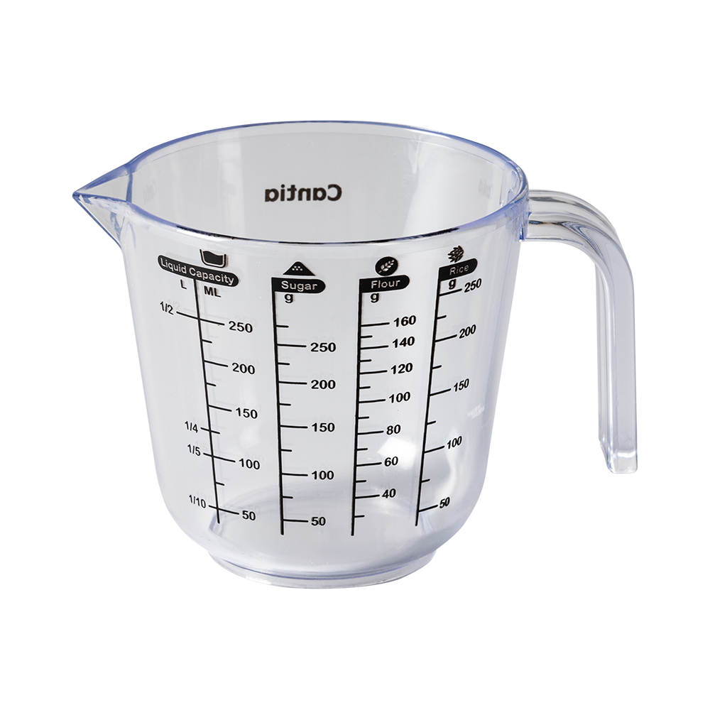 Taza medidora de 300 ml de 12.7 cm de largo x 8.9 cm de ancho x 8.9 cm de alto, fabricado en plástico.